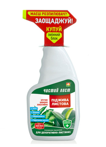 Удобрение подкормка листовая для декоративно-лиственных от ТМ Чистое Лист – это специально разработанный комплекс питательных веществ в удобной жидкой форме, предназначенный для поддержания насыщенного цвета и здорового вида листьев. Средство быстро впитывается через листовую поверхность, активизирует фотосинтез и улучшает обменные процессы в клетках. Использование такой подкормки помогает устранить симптомы дефицита микро- и макроэлементов, повышает устойчивость к стрессовым условиям и предотвращает пожелтение листьев. Подходит для широкого спектра декоративно-лиственных растений: дифенбахии, калатеи, аглаонемы, альоказии, монстеры, филодендронов, фатсии, аспидистры, сциндапсусов, колеусов, папоротников, плющей и других комнатных культур, где главная декоративность сосредоточена именно в декоративной декоративности. Регулярное применение обеспечивает равномерный рост и яркость растений, делает их более выносливыми и привлекательными. Нормы внесения Нормы внесения В период покоя – раз в две недели. В период роста – раз в неделю. Высота растения Количество доз Особенности применения 0-30 см 1-2 дозы Опрыскивание растений с гладкими, нешершавыми листьями, при температуре не ниже +20 С. Не опрыскивать цветы и бутоны. Желательно производить тестовое опрыскивание на нескольких ветвях для изучения индивидуальной реакции. Избегать обработки под прямыми солнечными лучами и на протяжении. Дополняет корневую подкормку. 30-60 см 2-3 дозы 60-90 см 3-4 дозы 90-120 см 4-6 дозы Более 120 см Больше 6 доз Состав: Макроэлементы (мг/л): азот (N) - 30, фосфор (P2О5) - 25, калий (K2). Микроэлементы (мг/л): Железо (Fe) – 70, Медь (Cu) – 50, Магний (Mg) – 40, Марганец (Мn) – 14, Бор (В) – 10, Цинк (Zn) – 4, Молибден (Мо) – 0,3, Кобальт (С). Витамины групп (мг/л): Тиамин (B) – 100, Никотиновая кислота (PP) – 50, Аскорбиновая кислота (C) – 150. Янтарная кислота: 200. «Инновационная формула» удобрения содержит витамины и янтарную кислоту, именно поэтому применение «Пидживы листовой» повышает иммунитет растений к болезням и гнилостям, улучшает процесс клеточного дыхания, увеличивает энергию растений, предотвращает развитие хлороза, повышает жизнеспособность растений, обеспечивает быстрый рост кроны. Меры предосторожности: Не допускать попадания в пищу и внутрь организма; при попадании в глаза промыть большим количеством воды; при попадании внутрь организма срочно вызвать рвоту; обратиться к врачу. Хранить в недоступном для детей месте отдельно от лекарств и пищевых продуктов при температуре от 0 до +40 С. После 36 месяцев не теряет агрономическую ценность.