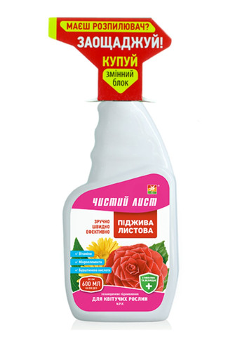 Удобрение подкормка листовая для цветущих растений от ТМ Чистое Лист – эффективное средство для стимуляции бутонизации и продления периода цветения. Удобрение содержит оптимально сбалансированный комплекс элементов, быстро усваиваемых через листовую поверхность и обеспечивающих растениям необходимое питание. Использование препарата способствует формированию большего количества бутонов, интенсивной окраске цветов и стойкости к болезням. Рекомендовано для применения на широкой группе цветущих растений: фиалках, бегониях, геранях, гибискусах, глоксиниях, антуриумах, орхидеях (на этапах цветения), пеларгониях, азалиях, фуксиях, каланхоэ и др. Подкормка не только помогает поддерживать активное цветение, но и восстанавливает растение после изнурительного процесса образования цветов, укрепляя его иммунитет и удлиняя декоративный эффект. Нормы внесения Нормы внесения В период покоя – раз в две недели. В период роста – раз в неделю. Высота растения Количество доз Особенности применения 0-30 см 1-2 дозы Опрыскивание растений с гладкими, нешершавыми листьями, при температуре не ниже +20 С. Не опрыскивать цветы и бутоны. Желательно производить тестовое опрыскивание на нескольких ветвях для изучения индивидуальной реакции. Избегать обработки под прямыми солнечными лучами и на протяжении. Дополняет корневую подкормку. 30-60 см. 2-3 дозы 60-90 см. 3-4 дозы 90-120 см. 4-6 дозы. Микроэлементы (мг/л): Железо (Fe) – 70, Медь (Cu) – 50, Магний (Mg) – 40, Марганец (Мn) – 14, Бор (В) – 10, Цинк (Zn) – 4, Молибден (Мо) – 0,3, Кобальт (С). Витамины групп (мг/л): Тиамин (B) – 100, Никотиновая кислота (PP) – 50, Аскорбиновая кислота (C) – 150. Янтарная кислота: 200. «Инновационная формула» удобрения содержит витамины и янтарную кислоту, именно поэтому применение «Пидживы листовой» повышает иммунитет растений к болезням и гнилостям, улучшает процесс клеточного дыхания, увеличивает энергию растений, предотвращает развитие хлороза, повышает жизнеспособность растений, обеспечивает быстрый рост кроны. Меры предосторожности: Не допускать попадания в пищу и внутрь организма; при попадании в глаза промыть большим количеством воды; при попадании внутрь организма срочно вызвать рвоту; обратиться к врачу. Хранить в недоступном для детей месте отдельно от лекарств и пищевых продуктов при температуре от 0 до +40 С. После 36 месяцев не теряет агрономическую ценность.