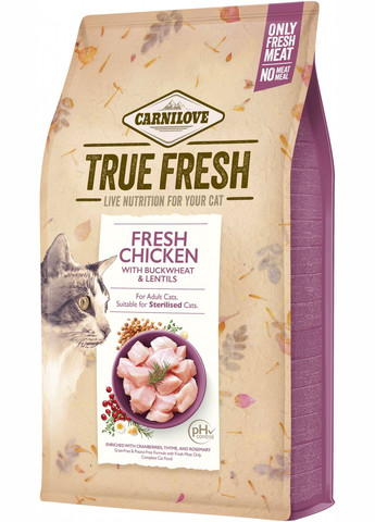 Полнорационный корм класса холистик для взрослых и стерилизованных кошек. Для поддержания иммунитета любимцев. Корм производится с использованием свежего мяса курицы, без зерна и картофеля. Рецептура обогащена клюквой, тимьяном и розмарином. 70% состава – свежее мясо курицы из фермерских хозяйств и местных поставщиков. Уникальный метод производства сохраняет полезные свойства мяса, отличный вкус, высокую усвояемость и естественную форму питания. Свежая курятина – отличный источник аминокислот с низким содержанием жиров, отлично подходит для наращивания мышц и поддержания иммунитета. Антиоксиданты, содержащиеся в чернике, облепихе и розмарине улучшают иммунные функции, играя важную роль в защите организма от инфекций, вызванных бактериями, вирусами и паразитами. Клюква, облепиха и черника помогают поддерживать оптимальный рН мочи и здоровое состояние мочевыводящих путей. Гречка, горох и чечевица являются естественным источником растительных белков и минералов, необходимых для здорового метаболизма. Состав: свежая курица (70%), гороховый протеин, красная чечевица, гречка (4%), природные ароматизаторы, куриный жир, лососевое масло (1%), хлорид натрия, хлорид калия, сушеная ламинария (Ascophyllum nodosum, 0.5%), протеин из ряски (Lemna) (0.5%), гороховая мука, сушеная облепиха (0.2%), сушеный корень имбиря (0.1%), сушеная черника (0.1%), сушеный розмарин (0.1%), сушеная клюква (vaccinium oxycoc) 0.1%), сушеный чабрец (0.1%), пивные дрожжи (источник маннанолигосахаридов, 0.015%), корень цикория (источник фруктоолигосахаридов, 0.015%), юкка Шидигера (0.008%). Пищевые добавки на 1 кг: витамин А (3a672a) 20000 МЕ, витамин D3 (3a671) 800 МЕ, витамин E (3a700) 600 мг, витамин C (3a312) 300 мг, таурин (3a370) 2500 мг, холина 3000 мг, L-карнитин (3a910) 100 мг, биотин (3a880) 2 мг, ниацинамид (3a315) 50 мг, йод (3b201) 4 мг, цинк (3b606) 120 мг, марганец (3b504) 5 ) 10 мг, железо (3b106) 45 мг, селен (3b810) 0.2 мг, L-метионин (3c305) 5000 mg (мг). Содержит одобренные ЕС антиоксиданты: экстракты токоферола из растительных масел (1b306(i)), аскорбил пальмитат (1b304) и экстракт розмарина. Содержит одобренные ЕС антиоксиданты: экстракты токоферола из растительных масел (1b306(i)), аскорбил пальмитат (1b304) и экстракт розмарина. Аналитический состав: сырой протеин 35.0%, сырой жир 13.0%, влажная 10.0%, сырая зола 9.6%, сырая клетчатка 3.8%, кальций 1.1%, фосфор 0.8%, натрий 1.2%, магний 0.04%, оме. , омега-6 жирные кислоты 1.3%, ЭПК (20:5-3) 0.15%, ДГК (22:6-3) 0.2%. Энергетическая ценность: 3.570 ккал/кг. Рекомендации по кормлению: когда Carnilove подаете впервые, смешайте его небольшое количество с привычным кормом и постепенно увеличивайте долю Carnilove. Можно подавать сухим или смешанным с влажным кормом Carnilove. Рекомендованное суточное количество указано в таблице кормления и может изменяться в зависимости от возраста, размера, уровня активности и окружающей среды. Следите, чтобы у вашего любимца всегда было много свежей питьевой воды.
