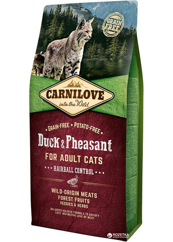 Carnilove Cat Duck & Pheasant Hairball Control — полнорационный беззерновой сухой корм класса холистик с мясом утки и фазана. Формула без зерновых и картофеля для взрослых кошек обогащенная свекольной клетчаткой, которая способствует выведению шерстяных комочков. Состав: мука из мяса утки (34%), мука из мяса фазана (25%), желтый горох (12%), куриный жир (консервированный токоферол, 6%), свекольный жом (5%), утка без костей (5%), куриная печень (3%), лососевое масло (2%), тапиоковый крахмал (2%), яблоки (2%), морковь (1%), семена льна (1%), нут (1% ), гидролизованные панцири ракообразных (источник глюкозамина, 0.026%), хрящевой экстракт (источник хондроитина, 0.016%), пивные дрожжи (источник маннанолигосахаридив, 0.016%), корень цикория (источник фруктоолигосахариды, 0.012%), экстракт юкки Шидигера (0.01 %), водоросли (0.01%), подорожник (0.01%), тимьян (0.01%), розмарин (0.01%), орегано (0.01%), клюква (0.0008%), черника (0.0008%), малина (0.0008%). Энергетическая ценность: 3800 ккал/кг. Омега-3: 0.33%, Омега-6: 2.28%. Рекомендации относительно кормления: давать корм сухим или смоченным в теплой воде или бульоне. Кормить кота необходимо три раза в день. Количество корма может быть изменена в зависимости от возраста и активности вашего кота. Когда кормите кормом Carnilove впервые, смешивайте небольшое количество с предыдущим кормом, и увеличивайте соотношение постепенно в течение недели. Всегда проверяйте наличие свежей воды.