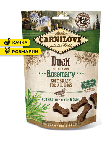 Carnilove Semi-Moist Duck enriched with Rosemary – полувлажное беззерновое лакомство с уткой и розмарином для собак. Обольщают любимцев своим экзотическим вкусом, а особый состав снеков улучшает здоровье зубов и десен. Рекомендации по кормлению: соблюдать рекомендательные нормы, указанные на упаковке товара. Старайтесь не перекармливать любимца. Следите за тем, чтобы в питомца был всегда доступ к питьевой воде. Состав: 35% сушеная утка, желтый горох, жидкий овощной крахмал, соус из утки, соус из печени птицы, коллаген, 1% розмарин, жир лосося. Аналитические компоненты: сырой протеин 32,0%, сырой жир 6,0%, влажная 17,0%, сырая зола 7,0%, сырая клетчатка 1,0%, кальций 1,2%, фосфор 1,0%, омега-3 0,1%, омега-6. С натуральными консервантами: лимонная кислота, DL-яблочная кислота. Энергетическая ценность: 3 200 ккал/кг