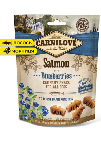 Carnilove Crunchy Salmon with Blueberries – изысканное лакомство со свежим лососем и черникой для собак. Снеки имеют беззерновую рецептуру, а черника является природным источником антиоксидантов для правильной функции мозга. Рекомендации по кормлению: соблюдать рекомендательные нормы, указанные на упаковке товара. Старайтесь не перекармливать любимца. Следите за тем, чтобы в питомца был всегда доступ к питьевой воде. Состав: лосось 50% (лосось сушеный 35%, лосось свежий 15%), тыква 15%, желтый горох 8%, сушеные яблоки 5%, морковь 5%, нут 4%, черника 4%, куриный жир (консервированный токоферолами) 2%, 2% льняное масло 1%. Аналитические компоненты: сырой протеин 33,0%, сырой жир 11,0%, влажная 10,0%, сырая зола 7,5%, сырая клетчатка 5,8%, кальций 1,1%, фосфор 0,9%, омега-3 0,5%, омега-6. Содержит природные антиоксиданты. Энергетическая ценность: 3 380 ккал/кг