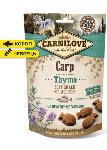 Carnilove Semi-Moist Carp with Thyme – полувлажное беззерновое лакомство с карпом и тимьяном для собак. Обольщают любимцев своим экзотическим вкусом, а особый состав снеков улучшает обмен веществ в четырехлапых. Рекомендации по кормлению: соблюдать рекомендательные нормы, указанные на упаковке товара. Старайтесь не перекармливать любимца. Следите за тем, чтобы в питомца был всегда доступ к питьевой воде. Состав: 35% сушеный карп, желтый горох, жидкий овощной крахмал, соус из лосося, соус из печени птицы, коллаген, 1% чабрец, жир лосося. Аналитические компоненты: сырой протеин 33,0%, сырой жир 5,0%, влажная 17,0%, сырая зола 7,5%, сырая клетчатка 1,0%, кальций 1,0%, фосфор 0,9%, омега-3 0,4%, омега-6. С натуральными консервантами: лимонная кислота, DL-яблочная кислота. Энергетическая ценность: 3 150 ккал/кг