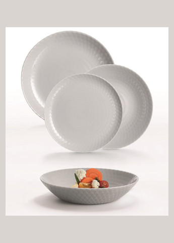 Сервиз столовый Pampille Granit Количество персон: 6 Материал: стекло Luminarc® – бренд высококачественной посуды, выпускаемый французским производителем посуды Arc International. Торговая марка Luminarc выпускает свою продукцию с 1948 года. Ее главной отличительной особенностью является качество и ударопрочность, что очень важно. С каждым годом компания усовершенствует технологии и улучшает качество своего стекла. У них получилось создать такое высокопрочное стекло, которому не страшны ни удары, ни перепады температур. Также к достоинствам данного материала можно отнести совершенно гладкую поверхность, препятствующую проникновению бактерий и посторонних запахов в посуду. Можно использовать в микроволновой печи, а так же мыть в посудомоечной машине. Особенности: французское качество материалов, дизайнов и декоров; стойкость к повреждениям при ежедневном использовании; изготовлено из закаленного стекла – наиболее гигиенического материала; выдерживает перепады температуры до 130 °С, что позволяет использовать посуду в микроволновке; можно использовать в посудомоечной машине; полное соблюдение норм и стандартов безопасности и экологичности для потребителя. Pampille – это красочная коллекция с фактурным структурированным дизайном. Благодаря своей эстетичности посуда данной серии идеально подходит как для ежедневного использования, так и для торжественного праздничного ужина. Эта коллекция включает в себя: обеденные тарелки 25 см, суповые 20 см и десертные 19 см, идеально сочетающиеся как с универсальными чашками и бокалами, так и с салатниками ТМ Luminarc. Посуда серии Pampille доступна в белом, сером и бирюзовом цветах. Его тонированный цвет в массе гарантирует вам бесподобную долговечность. Комплектация: Десертная тарелка 19 см – 6 шт Обеденная тарелка 25 см – 6 шт Суповая тарелка 20 см – 6 шт