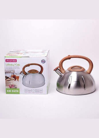 Чайник Kamille Whistling Kettle объемом 5 литров — это идеальный выбор для любителей чая и тех, кто ценит комфорт и стиль в своей кухне. Изготовленный из высококачественной нержавеющей стали, этот чайник станет незаменимым помощником в приготовлении ароматного чая для семейных или дружеских чаепитий. Чайник Kamille выделяется своим современным дизайном и функциональностью. Его комбинированная зеркальная и сатиновая полировка не только придает ему эстетичный вид, но и обеспечивает гигиеничность, так как материал не окисляется и не меняет вкус воды, даже при высоких температурах. Это делает чайник идеальным для ежедневного использования. Преимущества: Большой объем: 5000 мл позволяет заваривать чай для всей семьи или компании друзей. Безопасность: Нержавеющая сталь не подвергается коррозии и гарантирует отсутствие вредных веществ. Удобство использования: Ручки бакелитовые с покрытием SOFT-TOUCH не нагреваются и обеспечивают надежный захват. Функция свистка: Удобный клапан-свисток уведомит вас о закипании воды, что предотвратит ее выкипание. Совместимость: Многослойное индукционное дно подходит для всех типов плит: газовых, электрических, стеклокерамических и индукционных. Эффективность: Быстрое и равномерное нагревание, а также длительное удержание тепла. Этот чайник предназначен для всех, кто ценит качественные и стильные кухонные принадлежности. Он станет отличным вариантом как для домохозяек, так и для любителей чаепитий, обеспечивая комфорт и безопасность при использовании. Чайник Kamille Whistling Kettle — это не просто кухонный аксессуар, а стильный элемент вашего интерьера, который радует глаз и делает процесс приготовления чая более приятным. Упакованный в цветную фирменную коробку, он станет отличным подарком для друзей и близких.