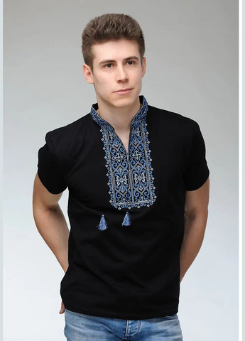 Мужская футболка с черным основанием и контрастной геометрической вышивкой выполнена в этническом стиле. Орнамент расположен вертикально на груди, напоминая классическую вышиванку, что делает эту модель универсальной – подходит и для повседневной носки, и для торжественных событий.