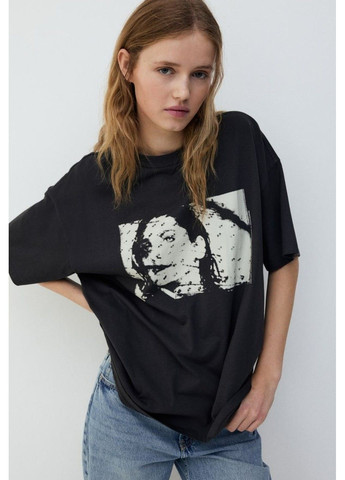 Футболка из хлопкового трикотажа. С печатным мотивом. Она имеет ребристый вырез, спущенные плечи и прямое деление. Объемный крой создает приятный, очень свободный силуэ.