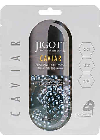 Jigott Caviar Real Ampoule Mask – листовая маска, пропитанная высококонцентрированной эссенцией. Основа продукта изготовлена из природного хлопкового материала, деликатно влияет на эпидермис и не вызывает аллергических реакций. Его состав обогащен экстрактом черной икры, содержащим множество минералов, витаминов и микроэлементов. Благодаря плотному контакту с лицом, продукт гарантирует интенсивное насыщение кожи полезными веществами. Герметичная упаковка имеет компактный формат, поэтому вы сможете осуществить уход в любом удобном месте! Особенности ампульной маски «Икра» от Jigott: - придает коже упругость и эластичность; - обеспечивает оптимальную увлажненность в течение длительного времени; - подтягивает щечки, скулы и подбородок; - повышает способность эпидермиса производить коллаген и эластин; - ускоряет процесс клеточного восстановления; дарит шелковистую гладкость и естественный блеск. Способ применения: 1. На очищенную кожу лица наложите маску-салфетку, разгладьте ее, обеспечивая плотное прилегание к коже лица.2. Снимите маску через 20–30 минут. Для достижения наилучшего эффекта применяйте маску-салфетку 3-4 раза в неделю.