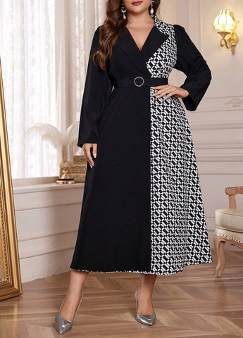 Асимметричное черно-белое платье-рубашка из принтованного софта с кружевом. Модель с короткой планкой на пуговицах, V-образной не глубокой проймой горловины и длинными рукавами на манжетах. Модель свободного расклешенного кроя с длиной ниже колен. Полуобхват: Грудь: S (45), M (47), L (49), XL (51), XXL (53), 3XL (54), 4XL (57), Талия: S (46), M (48), L (50), XL (50), XXL (53), 3XL (56), 4XL (58), Бедра: S (67), M (69), L (71), XL (71), XXL (76), 3XL (77), 4XL (79), Длина изделия - 100/107, Рукав - 61, Ткань: Низкой эластичности.