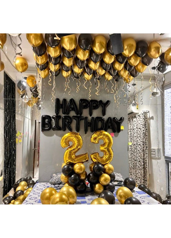 Элегантный набор в черном и золотом цветах – отличное решение для оформления юбилея или дня рождения. Добавляет стилю фольгированную надпись Happy Birthday. Состав набора Шары латекс • Пастель Черный 10″ (25 см) — 40 шт • Хром Золото 10″ (25 см) — 30 шт Шары фольгированные • Надпись надувная Happy Birthday Черный 40 см — 1 шт • Цифра на выбор — 2 шт Аксессуары Малярная лента 10 м – 1 шт • Клеевые точки – 1 рулон (100 шт)