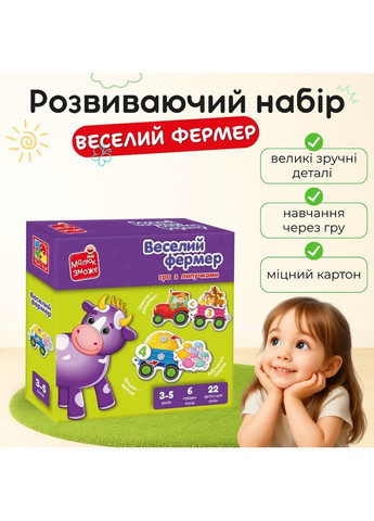 Загляни в гости к весёлому фермеру! Вместе с ним ты познакомишься с домашними животными, научишься считать от 1 до 10 и обратно, а также решать простые неравенства. Прикрепляй животных к кузовам с помощью липучек, считай их и подбирай нужную цифру. Играя, ты развиваешь внимание, логику, интеллект, мелкую моторику и память!