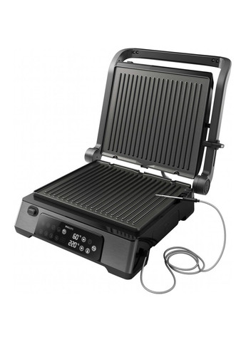 Цифровая регулировка для идеальных результатов Установите необходимую температуру для приготовления сочных, идеально прожаренных блюд. Готовьте бутерброды, мясо и овощи на гриле так, как вы любите. 8 установленных функций облегчают приготовление блюд на гриле Жарьте на гриле с помощью 8 кнопок для размораживания, приготовления бургеров, рыбы, курицы, овощей и мяса (разной степени прожарки). Пищевой термометр, позволяющий готовить именно так, как вы любите Готовьте мясо на гриле в соответствии с собственными предпочтениями с помощью встроенного датчика температуры. Таймер для точного приготовления Не допускайте пережарки благодаря встроенному таймеру, который отключает нагревание после приготовления на гриле. Съемные части легко чистить Антипригарные пластины и лоток для сбора жира легко снимаются, что облегчает чистку. Высокая мощность для быстрого приготовления Мощность быстро нагревает пластины гриля и поддерживает точную, постоянную температуру для идеальных результатов. Возможность регулировки высоты позволяет готовить все любимые блюда. Легко регулируйте высоту верхних грамм для приготовления толстых продуктов или открытых бутербродов. Большая поверхность гриля позволяет готовить еду для всей семьи. Независимо от того, готовите ли вы на одного или многих людей, большая поверхность гриля справится со всеми задачами. Съемные антипригарные пластины для легкого приготовления Что бы вы ни готовили, со съемными антипригарными пластинами для гриля вы сможете легко приготовить блюдо и очистить гриль. Открывается на 180° для жарки на гриле Раскройте бутербродницу на 180°, чтобы поджарить мясо и овощи на гриле с обеих сторон. Съемный лоток для сбора жира Вытапляйте жир и собирайте в лоток, который снимается для легкой очистки. Блокировка ручки для переноски и хранения Закройте и заблокируйте ручку, чтобы безопасно переносить и хранить гриль.
