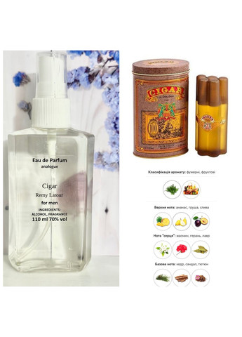 Парфюмированная вода для мужчин, версия Cigar Аромат: Тип аромата: Фруктовые, Фужерные. Начальная нота: Ананас, Бергамот, Груша, Лимон, Слива. Нота сердца: Герань, Жасмин, Календула, Лавр. Конечная нота: Кедр из Вирджинии, Мускус, Пачули, Сандал, Табак. Объём: 40 мл. Казалось бы, что прекрасного может быть в табачном дыме, чем может этот едкий запах привлечь столь чувствительный и прихотливый нос, как нос парфюмера. Возможно, дым дешевой сигареты никого и не привлечет, но вот дорогая изысканная сигара – это очень даже интересный объект для исследования, и даже предмет вдохновения мастеров искусства парфюмерии. Речь идет о замечательном парфюмерном продукте Cigar, который, хотя и вдохновлен сигарами и носит соответствующее название, на самом деле очень сложен и хорошо слажен. Все компоненты композиции подобраны с тончайшим вкусом и огромной тщательностью, чтобы в итоге получилась уникальная ароматическая композиция, достойная самых прихотливых и давно искушенных в этой области клиентов. Древесные оттенки, переплетенные с мускусными тонами, придают аромату яркости, насыщенности, и будто-бы элитарности. Владелец аромата туалетной воды Cigar выглядит уверенным в себе, элегантным, уделяющим внимание мелочам, не поскупившимся на то, чтобы создать себе достойный образ и подчеркнуть статус. Такие люди вызывают к себе уважение и воспринимаются не иначе как настоящие мужчины, хозяева своей жизни.
