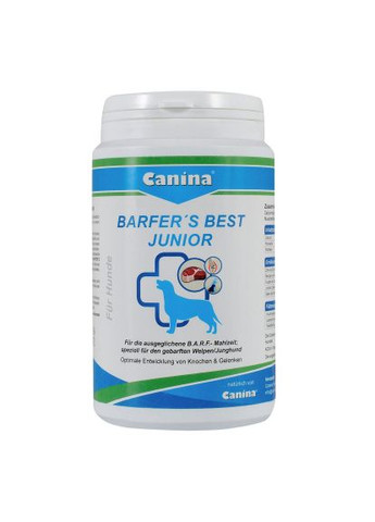 Растущему организму щенков и молодых собак, питающихся по системе BARF (система питания, в основу которой входят сырые натуральные продукты в т.ч. сырое мясо) во избежание дефицита витаминов и минералов в организме необходим их дополнительный источник. Витаминно-минеральный комплекс Canina (Канина) Barfer`s Best Junior разработан специально для щенков и молодых собак, поскольку в период роста животные испытывают повышенную потребность в витаминах и минералах это связано с быстрым развитием костной и мышечной ткани, ростом зубов и их сменой, ростом шерсти взамен щенячьего покрова. Витаминно-минеральный комплекс Canina (Канина) Barfer's Best Junior создан из натуральных продуктов и не содержит искусственных ароматизаторов и красителей, он легко усваивается и благодаря своим отменным вкусовым качествам отлично съедается собаками. Этот препарат диетологи рекомендуют применять на протяжении всего периода роста вашего питомца. В препарат Canina (Канина) Barfers Best Junior кальций входит в виде Цитрата кальция, который легко усваивается и не перегружает организм собаки, а витамин D3 способствует его усвоению и является профилактикой рахита. Морские водоросли Ascophyllum nodosum, входящие в состав корма, богаты микроэлементами и благоприятно влияют на состояние кожного покрова и шерсти, улучшая ее пигментацию и улучшают обмен веществ. Дрожжи, в составе препарата, пополняют запас витаминов группы В, биотина, цинка, фтора и влияют на состояние нервной системы, рост и густоту шерсти, поддерживают активность вашего питомца. Состав: кальций — 23,2%, фосфор — 2,34%, натрий — 3,38%, сырая зола — 70,3%, сырой протеин — 8,8%, сырой жир — 1,2%, сырая клетчатка — 0,4%. Дополнительные вещества на 1 кг: оксид цинка — 800 мг, оксид марганца — 186 мг, пентагидрат сульфат меди — 155 мг, кальций йодатгексагидрат — 12,4 мг, селенит натрия – 3,6 мг, карбонат моногидрат кобальта — 2,8 мг.