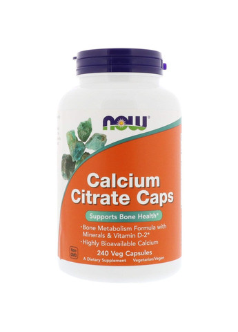 Calcium Citrate от Now Foods представляет собой вегетарианскую формулу в капсулах, цель которой — поддержка здоровья костной системы у взрослых Состав: Порция: 3 капсулы Порций в упаковке: 80 Состав одной порции % от суточной потребности Витамин D (эргокальциферол - вегетарианский источник) 750 МЕ (19 мкг) 95% Кальций (цитрата кальция) 450 мг 35% Магний (оксид магния) 225 мг 54% Цинк (аминокислота хелат) 11 мг 100% Медь (из меди аминокислоты хелат) 0,75 мг 83% Марганец (из марганца аминокислоты хелат) 4 мг 174%