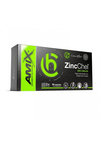 Amix Nutrition ChelaZone ZincChel - это пищевая добавка со 100% содержанием наилучшей и легкоусвояемой формы цинка, хелата бисглицината цинка.Особенности:поддержание нормального уровня костей, волос, ногтей, кожиподдержание нормальной функции иммунной системызащита клеток от окислительного стрессаиграет роль в процессе клеточного деленияМинеральные хелаты ChelaZone являются естественной формой минералов для человеческого организма. Они очень легко и быстро усваиваются, положительно влияют на общее удобство использования минерала и особенно на его эффективность.Как принимать:Принимать по 1 капсуле в день во время еды. Запивать большим количеством воды. Содержание элементов в 1й порции1 капсула, Цинк (из хелата бисглицината цинка ChelaZone) 30 мг, , Ингредиенты, микрокристаллическая целлюлоза, растительная капсула Vcaps Plus (гипромеллоза, краситель: диоксид титана), растительный стеарат магния и диоксид кремния.