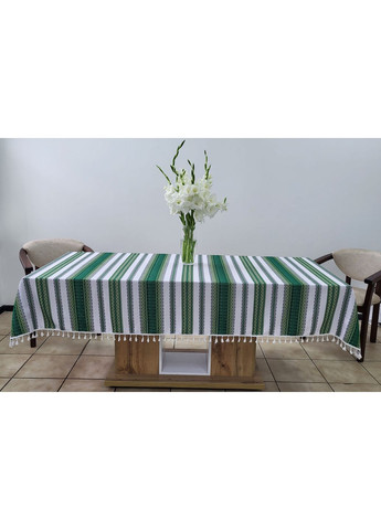 Ткано-декоративная скатерть с вышивкой "Косариковая зеленая" _1450*2200 Если вы еще не выбрали подарок на день рождения для хорошей украинской хозяйки, на семейный юбилей, новоселье или презент для иностранной семьи, тогда хорошая украинская скатерть - беспроигрышный вариант. Это в то же время интересно и практично. Размер скатерти (мм) – 1450*2200 (размер без торок); Торки – хлопковое кружево, цвет белый, длина торок 3см(30мм); Цвет ткани – белый; Цвет орнамента – зеленый, лимонно-желтый, черный; Состав ткани - Полиэстер 44% Акрил 35% Хлопок 21%; Вид переплетения – комбинированное; Тип рисунка – этнорнамент, машинная вышивка; Также на сайте доступны другие модели и размеры этноскатертин.