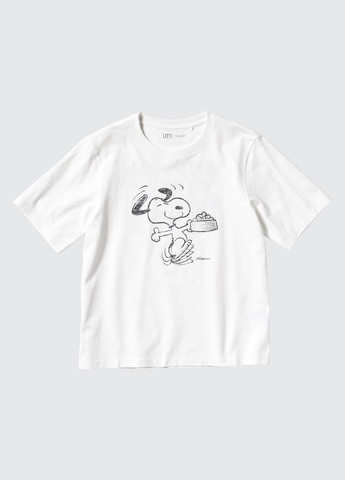 Футболка UNIQLO. Стильная футболка с принтом спереди и надписью сзади. Благодаря цитатам и иллюстрациям из книги "A Treasury of Happiness" усвоите несколько уроков и получите массу удовольствия, надев эту новую коллекцию Peanuts с друзьями.  Эта удобная футболка выполнена из плотного мягкого хлопка, подарит комфорт на весь день. Классический круглый вырез и короткие рукава делают её универсальной основой гардероба. Горловина в рубчик. Отличное качество.