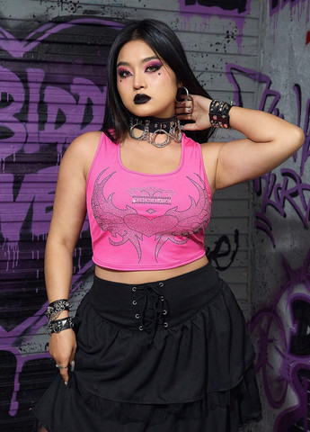 Топ изготовлен из эластичного трикотажа в рубчик, имеет забавный геометрический принт и блестящие украшения из стразов. Эта безрукавка большого размера, которая идеально подходит для повседневных образов на День Святого Валентина или вечернего отдыха с друзьями, обязательна для всех, кто любит стиль грандж 90-х.