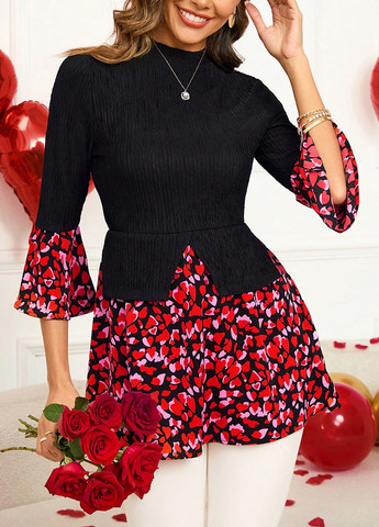 Блуза на День святого Валентина с узором в форме сердец. Рукав-клеш длиной три четверти.