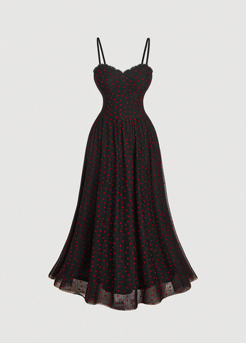 Это черное платье имеет романтичный дизайн с сердечками, подходит для особых случаев, таких как День святого Валентина. Платье имеет стандартный крой с оборками. Оно сшито из ткани средней эластичности. Подол расклешенный, а вырез на бретельках. Высокая талия завершает этот стиль.