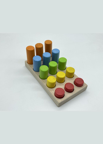 Комод состоит из 4 тематических ящиков для сортировки вкладышей по цвету, рисунку и 1 ящика, где находятся планки для укладки. В наборе 6 планок и 30 фигур для сортировки по цвету и форме