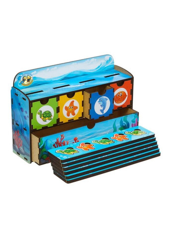 Комод состоит из 4 тематических ящиков для сортировки вкладышей по цвету, рисунку и 1 ящика, где находятся планки для укладки. В наборе 6 планок и 30 фигур морских обитателей для сортировки.