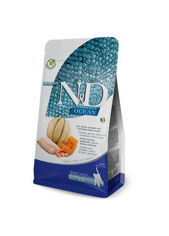 Farmina N&D Grain Free Kitten Cod, Shrimp, Pumpkin & Melon - полноценный сухой корм для котят, беременных и кормящих кошек с треской, креветками, тыквой и дыней.Natural & Delicious- это линия натуральных беззерновых продуктов, научно разработанная в соответствии с плотоядной природой кошек. Имеет низкий гликемический индекс.Продукты питания содержат экстракты, богатые токоферолами, которые позволяют сохранить продукт естественным образом. Natural & Delicious также богат высококачественными витаминами благодаря использованию холодного отжима после процесса выпекания, что предотвращает термическое повреждение витаминов.Состав: свежая треска (32%), дегидратированная треска (30%), сладкий картофель, рыбий жир (сельди), дегидратированная креветка (5%), сушеная тыква (5%), дегидратированная сельдь, сушеная морковь, сушеная люцерна, инулин, фруктоолигосахариды, дрожжевой экстракт (источник маннoолигосахаридов), сушеная мускусная дыня (0,5%), сушеный гранат, сушеный шпинат, подорожник, сушеная черника, сушеные яблоки, хлорид натрия, хлорид калия, сухие пивные дрожжи, корень куркумы (0,2%), экстракт алоэ вера.Пищевые добавки на 1 кг: Витамин А – 18000ME; Витамин D3 – 1200ME; Витамин Е – 600мг; Витамин С – 300мг; Ниацин – 150мг; D-кальция пантотенат – 50мг; Витамин В2 – 20мг; Витамин В6 - 8,1мг; Витамин B1 – 10мг; Биотин - 1,5мг; Фолиевая кислота - 1,5мг; Витамин B12 - 0,1мг; Холина хлорид – 2500мг; Бета- каротин - 1,5мг; Цинк (Хелат цинка гидрокси-аналога метионина) - 163,8мг; Марганец (Хелат марганца гидрокси-аналога метионина) - 64,6мг; Железо (Хелат железа гидрата глицина) - 58,3мг; Медь (Хелат меди гидрокси-аналога метионина) - 15,8мг; DL-метионин, технически чистый – 5000мг; Таурин – 4000мг; L-карнитин – 300мг. Специальные добавки: экстракт зеленого чая – 100мг; экстракт розмарина. Антиоксиданты: экстракт токоферолов натурального происхождения.Питательные вещества: сырой белок - 44,00%; сырой жир и масла - 20,00%; сырая клетчатка - 1,80%; влага – 8,00%; сырая зола - 8,50%; кальций - 1,00%; фосфор – 0,90%; магний - 0,08%; Омега-6 - 3,10%; Омега-3 – 1,40% (в том числе докозагексаеновая кислота (DHA) - 0,70%; эйкозапентаеновая кислота (EPA) - 0,40%). ЭНЕРГЕТИЧЕСКАЯ ЦЕННОСТЬEM Kcal/Kg 4204 - Mj/Kg 17,59Рекомендации по применению. Рекомендованное суточное количество корма указано в таблице на упаковке. При переводе на N&D рекомендуется постепенно замещать предыдущий корм на новый. Для кошек в течение последних двух недель беременности и в период лактации рекомендовано кормление вволю. Всегда оставляйте миску свежей питьевой воды в течение дня. Хранить в прохладном, сухом месте, в закрытой упаковке. Произведено за 18 месяцев до окончания срока годности, указанного на упаковке. Масса нетто, срок годности, код партии и регистрационный номер: см. упаковку