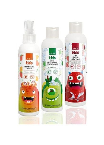 Набор из 3 предметов включает в себя: • Шампунь и кондиционер Avon Kids 2в1. Яблоко. 200мл. • Спрей для распутывания волос Avon Kids. Монго. 200мл. • Пена для ванны и гель для тела Avon Kids 2в1. Клубника. 200мл. От удивительных яблок до прекрасных манго, это детское фруктовое трио для купания, созданное для того, чтобы добавить много удовольствия во время купания, а формулы без слез означают, что веселье не должно прекращаться. Кроме того, спутанные волосы не будут травмироваться благодаря спрею для распутывания, способному превращать спутанные пряди в гладкие пряди. Страна-производитель Польша.