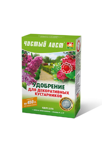 Витаминный комплекс, специально разработанный для декоративно-лиственных и цветущих кустарников. Обеспечит полноценное питание. Может использоваться в любой системе полива. способствует быстрому и пропорциональному росту кустарников, стимулирует обильное цветение, повышает устойчивость к неблагоприятным факторам. Упаковка: 300 грамм (на 450 литров). Макроэлементы (%): N - 20 P2О5 - 7.6; K2О - 14. Мезоэлементы (г / кг): S - 38, MgO - 3,2. Микроэлементы (г / кг): Бор (В) - 0,31; Железо (Fe) - 1,6; Марганец (Мn) - 0,34; Цинк (Zn) - 0,32; Медь (Cu) - 0,23; Молибден (Мо) - 0,03; Кобальт (Со) - 0,02. Витаминный комплекс (мг / кг): Тиамин (В1) - 110; Аскорбиновая кислота (С) - 520; Никотиновая кислота (РР) - 210. Удобрение Чистый Лист для декоративных кустарников применяется для цветущих кустарников и живых изгородей . Свойства удобрения для декоративных кустарников способствует быстрому и пропорциональному росту кустарников, помогает образовывать большее число вегетативных побегов, укрепляет корневую систему, стимулирует обильное и долгое цветение, увеличивает количество бутонов, повышает устойчивость к неблагоприятным условиям, гнилям, заморозкам и болезням. Основное внесение удобрения для декоративных кустарников осенью (сухое внесение), весной (в начале роста), корневая подкормка, внекорневая подкормка. Детальная инструкция на упаковке. Отличное удобрение для балконных цветов удобрение для балконных цветов Биогумус Фертимикс, который укрепит иммунитет растений, ускорит процесс формирования соцветий и увеличит их количество.
