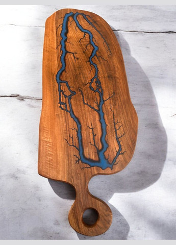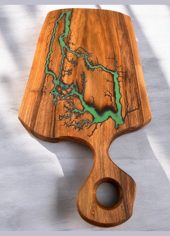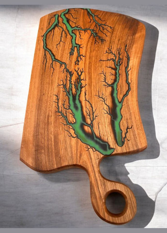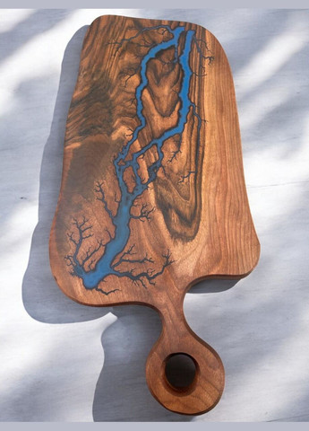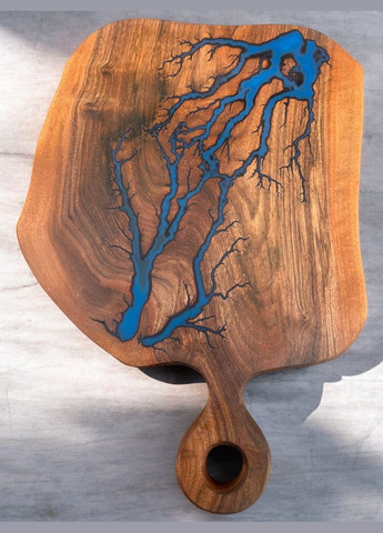 Деревянная доска, которая придаст оригинальность и индивидуальность вашей кухне. Она может использоваться как для нарезки, так и для удобной и красивой подачи закусок. Двухсторонняя. Доска изготовлена из Ореха, узор создан при помощи обжига и залит эпоксидной смолой. Доска защищена маслом и воском - пригодна для контакта с пищевыми продуктами. Великолепный эксклюзивный подарок к любому празднику. Рекомендации по уходу: - Не мыть в воде выше 40 градусов. - Протереть насухо полотенцем. Ни в коем случае не мыть в посудомоечной машине Не сушить на солнце, батарее, сушилке. Каждая доска представляет собой индивидуальное изделие ручной работы. Размер: 47x29x2 см. см. з ручкой (33х29х2) без ручки Материал-Орех