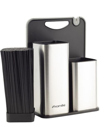 Подставка-бревно Kamille Kumamoto надежно и безопасно сохранит лезвия Ваших кухонных ножей, продлит срок их службы и гармонично впишется в дизайн Вашей кухни. Подходит для хранения и сушки ножей с лезвием любого типа (стальные, керамические, деревянные, пластиковые, полимерные). Форма тубуса прямоугольная, цвет стальной. Дополнительный отсек для хранения и сушки разных кухонных аксессуаров. Внутри подставки из нержавеющей стали – полипропиленовый наполнитель (полипропиленовое волокно). Наполнитель легко вынимается из подставки для мойки и ухода. Размеры подставки: 21х12х22см. Подходит для хранения ножей не длиннее 20см. Кроме того, в наборе идет разделочная пластиковая доска. Размер доски: 29.6х22.4х0.8см. Разделочная доска черного цвета с серым ободком по периметру и с разъемом для заточки ножей. Ручка-прорезь удобна как для поддержки, так и для подвеса. Подставка-колода Kamille Kumamoto – функциональный и стильный атрибут современной кухни!