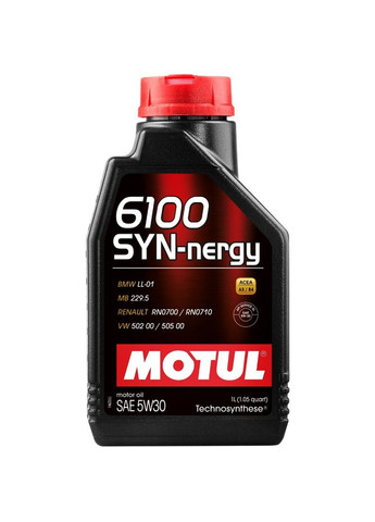 MOTUL 6100 SYN-nergy 5W-40 - улучшенное синтетическое моторное масло, изготовленное по технологии Technosynthese для высокой мощности и высокой защиты. Одобрение: MERCEDES, VAG (Volkswagen, Audi, Skoda, Seat), BMW, CHRYSLER, FORD, FIAT, PORSCHE, PSA (Peugeot, Citroën, DS), RENAULT. Специально разработана для современных легковых автомобилей, оснащенных мощными бензиновыми двигателями и дизелями, атмосферными или с турбонаддувом, с косвенным или непосредственным впрыском. Совместимость: Совместим с каталитическими нейтрализаторами (CAT). Совместимость с такими видами топлива: этилированный и неэтилированный бензин, этанол, LPG, дизельное топливо, биотопливо Преимущества: Высокая мощность: Улучшенная синтетическая формула для обеспечения высокой производительности двигателя. Высокая защита: обеспечивает надежную защиту от износа, коррозии и отложений даже в жестких условиях эксплуатации. Совместимость с топливом: Подходит для использования с различными типами топлива, включая этилированный и неэтилированный бензин, этанол, LPG, дизельное топливо и биотопливо. Экологичность: Соответствует экологическим стандартам и совместима с каталитическими нейтрализаторами (CAT). Рекомендации: * Перед применением обязательно сверьтесь с инструкцией по эксплуатации вашего транспортного средства.