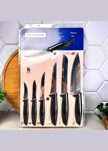 Комплектация набора: Нож Шеф 1 шт. - 170 мм/300 мм Нож для чистки овощей 1 шт. - 76 мм/180 мм Нож для нарезки овощей 1 шт. - 80 мм/190 мм Нож для стейка 1 шт. - 115 мм/220 мм Нож для мяса 1 шт. - 130 мм/263 мм Нож для хлеба 1 шт. - 160 мм/290 мм Нож для томатов 1 шт. 105 мм/210 мм Особенности: Лезвие: нержавеющая сталь AISI 420 Толщина лезвия: 1 – 1,2 мм Рукоятка: полипропилен Можно мыть в посудомоечной машине Бренд Tramontina основан в Бразилии в 1911 году. 10 фабрик, которые производят более 18 000 наименований. Один из лидеров мирового рынка по производству ножей, столовых и кухонных принадлежностей, посуды для приготовления пищи, инструментов для сельского хозяйства, строительства и сада. Tramontina производит кухонную утварь только из наилучшей 18/10 нержавеющей стали, отполированной до зеркального блеска, которая со временем не тускнеет и не темнеет. Каждый элемент разрабатывается с условием, чтобы он смог удовлетворить вкус, как обычного домовладельца, так и наиболее требовательного профессионального повара. Приносит удовольствие от процесса приготовления пищи и от того, как это объединяет людей вовлеченных в этот процесс.