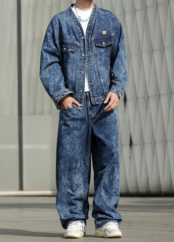 Мужской повседневный комплект Manfinity Hypemode. В комплект входят тёмная джинсовая куртка и мешковатые джинсы. Куртка имеет V-образный вырез и спущенные рукава. Джинсы стандартной длины и свободного кроя. Комплект изготовлен из хлопка, полиэстера, лиоцелла и вискозы. Только машинная стирка. Подкладка и ремень в комплект не входят.