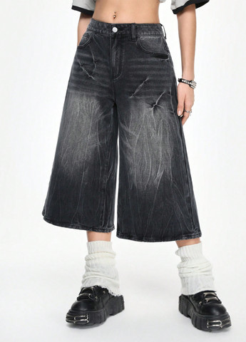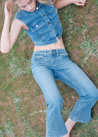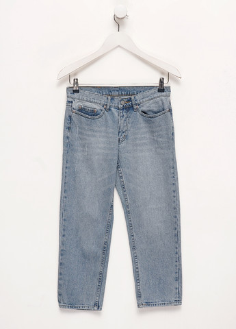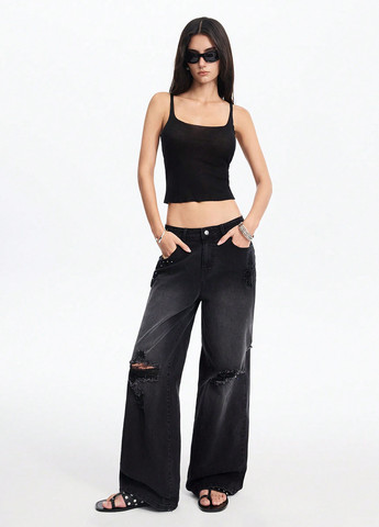 Джинсы с пятью карманами из стираного денима с вышивкой спереди и сзади. Свободная посадка сверху и зауженные книзу штанины с необработанным краем. Низкая талия и заниженный шаговый шов. Застежка на молнию.