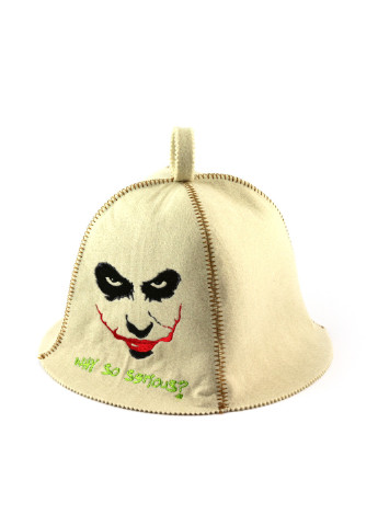Банная шапка незаменимый аксессуар при посещении бани и сауны. Кроме оригинального внешнего вида или веселого слогана вышитого на ней шапка выполняет очень важную роль - она бережет нашу голову от перегрева. Мы рекомендуем подходить к в выбору шапки для бани и сауны не менее ответственно, чем при выборе другого головного убора.Банная шапка с вышивкой "Джокер" изготовлена из искусственного фетра. Цвет фетра белый.Модель имеет сверху петельку, которая позволяет повесить шапку на крючок .Уход за изделием: В стиральной машинке изделия из фетра нужно стирать в режиме для шерсти, можно отжимать в деликатном режиме отжима. Температура воды не должна превышать 40 градусов, особенно если изделия цветные. Сушить нужно изделие в развернутом виде
