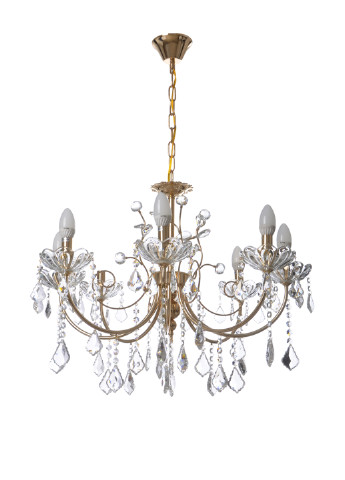 классическая люстра BCL-657S/8 E14 FGD символизирует тихие уютные вечера в кругу семьи. Ее мягкое, рассеянное освещение создает в помещении особенную камерную атмосферу. Материалами для ее изготовления послужили металл и стекло. Конструкция состоит из металлического золотистого основания, украшенного множеством подвесок со стеклянными прозрачными гранеными камушками и патронов для ламп, помещенных в прозрачные стеклянные тарелочки. Для работы необходимо использовать восемь лампочек с цоколем Е14 мощностью 60 Вт. Лучше всего выбирать лампы свечевидной формы, с ними люстра будет выглядеть гармонично. Высоту осветительного прибора можно изменять с помощью металлической цепи, путем удаления или добавления звеньев. Диаметр*высота, мм: 680*950