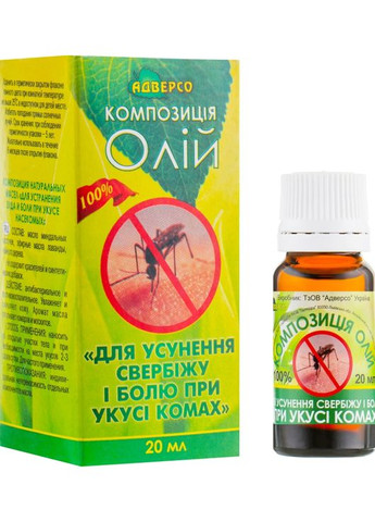 Находитесь в поисках эффективного репеллента? Украинский бренд «Адверсо», специализирующийся на производстве натуральных косметических средств, выпустил хорошую композицию эфирных масел «Для устранения зуда и боли при укусе насекомых». Этот продукт поможет не только снять неприятные ощущения от укусов назойливых кровососов, но и отпугнет вредителей, которые снова посягнули на вас! Композиция эфирных масел «Для устранения зуда и боли при укусе насекомых» от отечественного бренда «Адверсо» содержит такие ценные компоненты, как масло миндальных косточек, эфирные масла лаванды и чайного дерева. Средство обладает прекрасными увлажняющими, противовоспалительными и питательными свойствами.