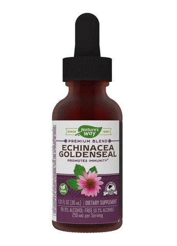 Эхинацея и гидрастис Echinacea Goldenseal Nature's Way Без спирта 99.9% 30 мл — концентрированный экстракт растительных компонентов для поддержки иммунитета и защиты организма в сезон простуд. В состав входят эхинацея, гидрастис (желтокорень), горечавка, лопух, кайенский перец и древесная камедь, которые помогают укрепить защитные силы, поддерживать здоровье дыхательных путей и улучшать общее самочувствие. Этот экстракт сочетает сразу несколько растений с выраженным воздействием на иммунную систему, работу слизистых оболочек и общую сопротивляемость организма. Эхинацея пурпурная и узколистная — натуральные иммуностимуляторы, которые помогают активизировать защитные силы организма. Они поддерживают иммунные клетки, помогают быстрее справляться с простудными инфекциями и уменьшают вероятность осложнений. Гидрастис (желтокорень) — содержит алкалоиды, которые помогают бороться с вредоносными микроорганизмами. Он поддерживает здоровье слизистых оболочек носа и горла, снижает воспалительные процессы и облегчает дыхание. Горечавка — традиционно используется для улучшения пищеварения и общего тонуса организма. Она способствует более быстрому восстановлению после заболеваний и усиливает действие других компонентов. Лопух — растение с очищающими свойствами, которое помогает организму выводить токсины и поддерживает работу лимфатической системы. Древесная камедь — содержит природные соединения, которые помогают снизить воспалительные процессы в организме и поддерживают иммунную функцию. Кайенский перец — стимулирует кровообращение, помогает улучшить обмен веществ и поддерживает естественные защитные механизмы организма. Этот экстракт помогает активировать иммунную систему, обеспечивая быструю поддержку в периоды сезонных простуд и ослабленного иммунитета. Он поддерживает здоровье слизистых оболочек, облегчает дыхание и способствует очищению организма. Благодаря комплексному составу он не только защищает от вирусов, но и помогает быстрее восстановиться после перенесенных инфекций. Эта добавка полезна тем, кто хочет поддерживать иммунитет в периоды сезонных заболеваний, быстрее восстанавливаться после простуды и укреплять естественную защиту организма. Она может быть полезна при первых признаках простуды, в периоды стресса или высокой нагрузки на иммунную систему. Преимущества комплекса: Натуральная формула без спирта, подходит для детей и взрослых. Поддержка иммунной системы в сезон простуд и повышенной нагрузки. Помогает защитить слизистые оболочки и дыхательные пути. Способствует очищению организма и быстрому восстановлению. Удобная жидкая форма для быстрого усвоения. Эхинацея и гидрастис Echinacea Goldenseal Nature's Way Без спирта 99.9% 30 мл — это натуральная поддержка иммунитета и защита в любое время года, особенно в периоды сезонных заболеваний. Рекомендации по применению Хорошо встряхните. Взрослым принимать по 1 мл 3 раза в день, запивая небольшим количеством воды. Дети младше 12 лет принимают ½ дозы для взрослых. Предоставляется удобная пипетка. После вскрытия упаковки продукт следует хранить в холодильнике. Состав Размер порции: 1 мл Порций в упаковке: 30 Количество в 1 порции % от суточной нормы Смесь трав: Экстракт эхинацеи пурпурной (надземные части), экстракт корня желтокорня, экстракт корня эхинацеи узколистно