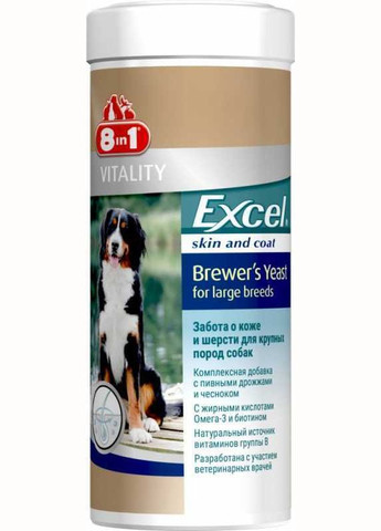 витаминная добавка в рацион собак больших пород для поддержания кожи и шерсти, в основе пивные дрожжи, так же в состав входит экстракт чеснока; добавка подойдет как в профилактических целях, так и для лечения витаминного дисбаланса, при нарушении пищеварения, при плохом аппетите, потере веса, ослабленном иммунитете; можно давать в межсезонье, чтобы собака легче переносила изменение погодных условий. Ингредиенты: пивные дрожжи (saccharomyces cerevisiae), стеариновая кислота, глицерин, чеснок, сафлоровое масло, диоксид кремния, жир тунца. Аналитический состав (средние значения): сырой белок – 43%, сырой жир – 7%, сырая клетчатка – 1%, зола – 9%, влажная – 8%. Витамины: Витамин В1 – 800 мг/кг, витамин В2 – 500 мг/кг, витамин В6 – 50 мг/кг, биотин – 1900 мкг/кг, ниацин – 1200 мг/кг Микроэлементы: железо – 1914 мг/кг, медь – 2,5 мг/кг, медь – 2,5 мг/кг, 3270 мг/кг, кобальт – 114 мг/кг Рекомендуемые нормы кормления (грамм/день): Давать собаке ежедневно по 1 таблетке на каждые 25 кг веса животного (перед кормлением). Рекомендованный курс применения 14-30 дней. Изменение дозировки или повторный курс по показаниям. При комнатной температуре в плотно закрытой упаковке, в недоступном для детей и животных. Срок годности: 27 месяцев с момента изготовления. Номер партии и срок годности указаны на дне упаковки. Использовать только для животных Фасовка: 80 таблеток