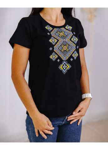 Футболка женская с вышивкой черная "Этника" украшена сине-желтым орнаментом, который придает ей национальный колорит и делает ее оригинальным элементом гардероба. Футболка вышиванка сделана из хлопкового трикотажа, что гарантирует максимальную практичность и универсальность каждой вещи. Модель свободного кроя, не стесняет движений. Материал очень приятный к телу. Футболки полномерные. Орнамент: машинная вышивка. Все швы на футболке ровные, без торчащих нитей. Это гарантирует вам комфорт во время носки. Наши мастера тщательно контролируют качество пошива всех изделий. Материал: Футболочный трикотаж (95% cotton, 5% elastane) Футболка-вышиванка – лучший компромисс между изысканностью вышиванки и удобством футболки!