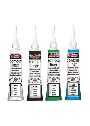 Контур универсальный – предназначен для 3Д выделения и создания узоров на любых типах поверхностей, таких как ткань, дерево, пластик, металл, картон, керамика и т.д. Основные характеристики: – на водной основе; - после высыхания становится водонепроницаемым и стойким; - может использоваться с красками для стекла на водных и сольвентных основаниях; - после росписи на ткани – требует фиксации утюгом, после чего готовое изделие можно стирать в стиральной машине. Палитра: 7 классических, 3 флуора (Glow in the dark), 7 металликов, 2 с блестками. Емкость: 20мл