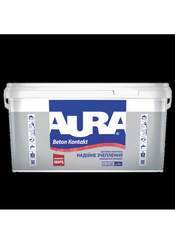 Свойства Адгезионная грунтовка с кварцевым песком для невпитывающих поверхностей. Имеет хорошую адгезию к невпитывающим воду основаниям. Содержит специальный набор кварцевых наполнителей. Хорошо и равномерно распределяется по поверхности. Равномерность нанесения грунтовки дополнительно определяется по однородности цвета покрытия. Создает шероховатую поверхность, которая обеспечивает надежную адгезию при нанесении тяжёлых штукатурок и шпатлёвок, клеящих смесей, структурных материалов, а также при облицовке керамической плиткой. После высыхания создает прочное и стойкое к влаге покрытие. Паропроницаемая. Не имеет неприятного запаха. Назначение Применяется для обработки плотных, глянцевых, невпитывающих и слабо впитывающих влагу минеральных оснований для создания промежуточного сцепляющего слоя перед нанесением штукатурок (гипсовых, гипсово-известковых, известково-цементных и т.п.), структурных красок и шпатлевок при внутренних и наружных работах. Может быть использована для обработки покрытий из керамической плитки перед повторной облицовкой керамической плиткой. Для внутренних и наружных работ. Типы поверхностей для нанесения Монолитные бетонные поверхности, керамическая плитка, гипсокартон, поверхности, окрашенные масляными и алкидными красками и др. Подготовка поверхности Поверхность должна быть сухой, тщательно очищенной от непрочного отслаивающегося поверхностного слоя, пыли, грязи, жира. Сильно загрязненные и жирные поверхности промыть 3-5% раствором соды, промыть водой и высушить. Непрочные и сильно впитывающие участки поверхности обработать укрепляющей грунтовкой ТМ Aura. Часто увлажняемые и подверженные образованию плесени поверхности обработать средством против плесени Biotol (или Biotol Spray). Металлические поверхности обработать антикоррозионной грунтовкой. Нанесение Готовая к применению. Перемешать. Наносить валиком или кистью в один слой при температуре грунтовки, основания, воздуха не ниже +5°С. Чем тяжелее финишный материал, тем расход грунтовки должен быть больше. Финишные материалы наносить после полного высыхания грунтовки. Рабочие инструменты Кисть, меховой валик. Очистка инструментов Сразу после использования промыть водой. Засохшая грунтовка очищается механически. Состав Сополимерная акриловая дисперсия, пигмент, кварцевый песок, наполнители, функциональные добавки, вода. Цвет Розовый Расход 250-300 г/м² (4,5-5,5 м²/л) на один слой. Расход зависит от вида финишного материала, поверхности, способа нанесения. Время высыхания 12–24 часа при температуре +20°С и относительной влажности воздуха 65%. При снижении температуры воздуха время высыхания увеличивается.