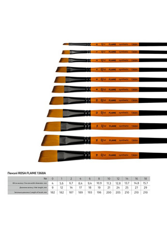 Серия FLAME. Кисти из эластичного синтетического волоса средней упругости идеально подойдут для работы акриловыми и гуашевыми красками. Эластичная, хорошо контролируемая синтетика рыжего цвета с темным кончиком хорошо держит форму в сухом и влажном состоянии. Подходят как для нанесения тонких линий, так и для создания плавных переходов, окраски больших площадей, для смешивания красок. Степень жесткости: ***Формы кистей на короткой ручке серии FLAME: круглая, плоская, овальная, веерная, скошенная. Плоские кисти используют для нанесения широких рельефных ровных мазков, окрашивания фона, покрытия больших поверхностей. Уровни углы вершины удобны для создания плавного перехода из одного цвета в другой и при смешивании цветов на палитре. При работе с густыми красками плоские кисти помогают сделать пастозные мазки. Основные характеристики синтетики плоской, FLAME 1368F, ROSA: - содержат много краски; - после смачивания пучок формирует плоский и тонкий кончик; - для четких линий и полос, создание плавного перехода одного цвета в другой; нанесение широких рельефных ровных мазков, заливок, фона и смешивания цветов; - хорошо контролируемый упругий волос используется для прописывания узоров, мелких элементов; - номера: 000, 00, 0, 1, 2, 4, 6, 7, 8, 10, 1, 2,
