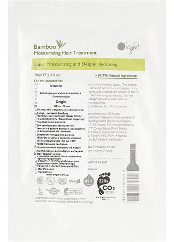 Частое применение фена, плойки и других горячих стайлеров, окрашивания, а также неправильный уход могут быть причиной поврежденных волос, секущихся кончиков. Органическая увлажняющая маска бренда O'right восстанавливает даже очень поврежденные локоны, улучшая их внешний вид. Активные компоненты маски интенсивно восстанавливают слабые, поврежденные пряди, увлажняют локоны, насыщают полезными компонентами, придают зеркальный блеск и эластичность. Органический экстракт листьев бамбука увлажняет и обеспечивает антиоксидантный эффект, помогая улучшить состояние поврежденных локонов. Особенности O'right Bamboo Moisturizing Hair Treatment: - подходит для обладательниц поврежденных волос; - предотвращает появление секущихся кончиков; - устраняет сухость локонов; - придает локонам здоровый блеск и эластичность; - подходит для домашнего и профессионального применения;