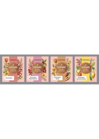 Коллекция чая Lovare Tisanes Rooibos (4 вида по 8 пакетиков) – это уникальный ройбуш ассорти четырех видов: Ройбуш – нежный орехово-медовый вкус ройбуша окутывает теплом и уютом в каждом моменте. Ройбуш-малина – мягкий ройбуш со сладкими ягодными нотами малины дарит яркий вкус и нежное наслаждение. Ройбуш-финик – насыщенный вкус фиников и медовый ройбуш – идеальное сопровождение для легкого десерта. Ройбуш-лемонграсс – элегантный вкус с тонкой сладостью, нежными нотами ройбуша и свежим аккордом лимонно-мятного букета (содержит стевию). Тип: Ассорти Разновидность: В пакетиках Аромат: Лемонграс Малина Лист: Мелколистовой Происхождение: Украинский Фасовка: Пакетики 32 шт. Состав: Чай "Ройбуш", "Ройбуш-Малина", "Ройбуш-Финик", "Ройбуш-Лемонграс" Упаковка: Картонная коробка Аллергены: Отсутствуют Прочность: 3 Срок хранения: 24 месяца Количество упаковок: 1 шт Страна регистрации бренда: Украина EAN:544