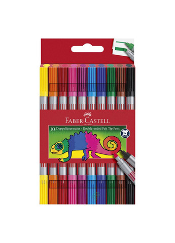 Фломастеры двухсторонние Fibre tip 10 ярких цветов; широкий наконечник фломастера для быстрой раскраски больших поверхностей; узкий наконечник фломастера для тонких линий и выделение деталей; чернила на водной основе и натуральных красителях; легко отстирать из большинства обычных тканей; вентиляционный колпачок