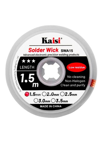 Оплетка для снятия припоя Kaisi 1515 / длина 1.5 м / ширина 1.5 мм представляет собой эффективный инструмент, предназначенный для удаления излишков припоя при проведении пайки. Она состоит из тонкой медной проволокой, вплетенной в специальную оплетку из волокон, которые часто пропитаны флюсом. Принцип работы прост: в момент пайки медные волокна оплетки впитывают расплавленный припой, обеспечивая эффективное удаление избыточного материала и создавая более чистые контакты. Этот инструмент является неотъемлемой частью процесса обслуживания и ремонта электроники, обеспечивая точность и высокое качество в работе с печатными платами и компонентами. Тип продукта: Оплетка для снятия припоя. Основное применение: Используется для эффективного удаления припоя с печатных плат и электронных компонентов во время ремонта и доработки электроники. Материал: Высококачественный медный сплав, обеспечивающий быстрое и равномерное поглощение припоя. Длина: Доступно в различных размерах, например, 1.5 м, 2 м, 3 м. Ширина: Различные варианты ширины, например, 2 мм, 2.5 мм, 3 мм, для работы с разными размерами пайки. Особенности: Низкое тепловое сопротивление для быстрого поглощения припоя, антиоксидантное покрытие для предотвращения коррозии. Преимущества: Удобство в использовании, высокая эффективность, предотвращение повреждения печатных плат. Упаковка: Компактная катушка для удобного хранения и использования. Оплетка для снятия припоя Kaisi 1515 / длина 1.5 м / ширина 1.5 мм изготовлена из высококачественных материалов, прошедших тщательный контроль на всех этапах производства. Это гарантирует надежность, долговечность и эффективность.