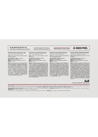 Описание MEDIPEEL Glutathione Multi Care Kit Состав набора: Осветительный тонер для лица - Medi-Peel Glutathione 600 Toner, 30 ml + Эмульсия с глутатионом для лица - Medi-Peel Glutathione 600 Emulsion, 30 ml + Сыворотка с лицом Medi-Peel Glutathione 600 Cream, 50 g. Для видимого усовершенствования кожи требуется комплексный подход. Благодаря бренду Medi Peel и его набору Glutathione Multi Care Kit вы сможете влиять на кожу интенсивно и многогранно, начиная с самого очищения. В нем вы найдете тонер, эмульсию, сыворотку и отбеливающий крем – настоящих помощников в вопросах пигментации и преждевременного старения. Результат не заставит себя долго ждать! Тонер для освещения лица - Medi Peel Glutathione 600 Toner: - является стартовым этапом после очистки; - расщепляет остатки загрязнений, косметики и токсинов, с которыми не справилась пенка для умывания; - освещает пигментные пятна и K0 разглаживает, увлажняет и освежает лицо; - придает лицу природное сияние; - при регулярном использовании усовершенствует текстуру кожи. разглаживает микрорельеф и оказывает мощный антиоксидантный эффект; - борется с первыми возрастными изменениями; - освещает пигментные пятна и постакне; - сохраняет оптимальный уровень влаги в течение длительного времени. Сыворотка с глутатионом - Medi Peel Glutathione 600 Ampoule: - устраняет хронические раздражения кожи; - отбеливает кожный покров, осветляет пигментные пятна и постакне; - Glutathione 600 Multi Care Kit насыщает покров витаминами и делает тон ярче; изломов. Отбеливающий крем для лица - Medi Peel Glutathione 600 Cream: - интенсивно питает, устраняет следы усталости; - насыщает кожу витаминами С и Е; - обладает антиоксидантными свойствами; - Glutathione 600 Multi Care Kit сокращает глубину морщин; - участвует в синтезе волокон; отбеливающие свойства. Способ применения Тонер для осветления лица - Medi Peel Glutathione 600 Toner Средство наносится утром и вечером после пенки или очистительной маски. Сыворотка с глутатионом Medi Peel Glutathione 600 Ampoule Наносится утром и вечером после тонера или вместо эмульсии. Отбеливающий крем для лица - Medi Peel Glutathione 600 Cream Средство наносится утром и вечером, дважды в день, завершающим этапом ухода. Состав Medi-Peel Glutathione 600 Toner Vitamin tree water, Glycerin, Dipropylene Glycol, Propanediol, Niacinamide, 1,2-Hexanediol, Caprylic/Capric Triglyceride, Purified water, PPG-13-Decyltetra Glycol, Hydrogenated Lecithin, Carbomer, Glutathione (674 ppm), Tromethamine, Cetearyl Alcohol, Disodium EDTA, Stearic Acid, Dipotassium Glycyrrhizate, Какаду Плум Extract, Butylene Glycol, Lecithin, Glycolin Folic Acid, Bacillus/Soybean Ferment Extract, Oligopeptide-1, Hexapeptide-11, Oligopeptide-2, Oligopeptide-3, Hydrolyzed Soy Protein, Madecassoside, Phytosterols, Sqlane, Olive Oil, Tocopherol, Polyglyceryl Hydrolyzed Hyaluronic Acid, Hydroxypropyltrimonium Hyaluronate, Hydrolyzed Sodium Hyaluronate, Potassium Hyaluronate, Ceramide NP, Sodium Ascorbyl Phosphate, Shea Butter, Ethylhexylglycerin, Sodium Hyaluronate Crosspolymer, Bio Riboflavin, Thiamine HCL, Retinol, Bioflavonoids, Sodium Acetylated Hyaluronate, Menadione, Acetyl Hexapeptide-8, Copper Tripeptide-1, Palmitoyl Pentapeptide-4, Linoleic Acid, Beta-Carotene, Fragrance